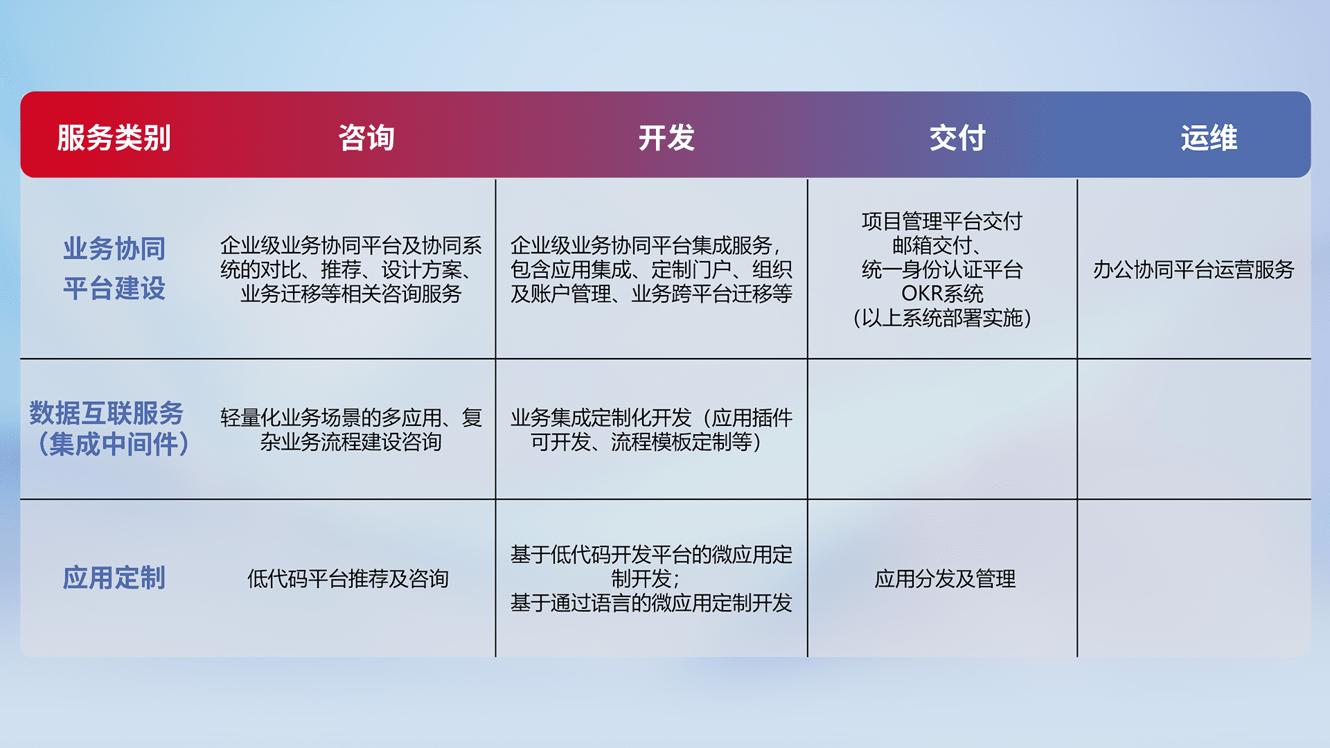 针对钉钉、、企微、、、IDaas等平台级产品提供产品的规划、、、、方案、、交付、、定制化开发等服务,,实现如统一协同办公、、智能客户服务、、、混合会议管理、、、、智能数据查询、、等业务场景,,实现数字化转型。。。。
